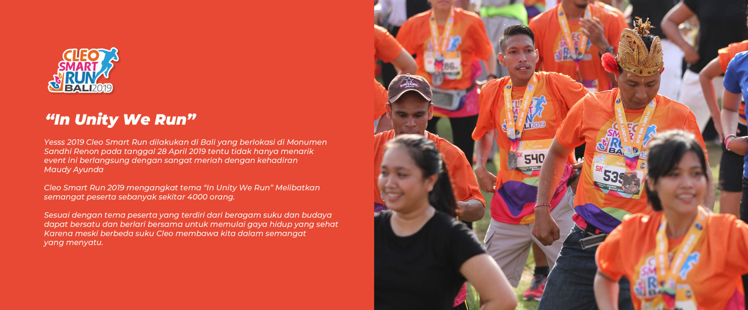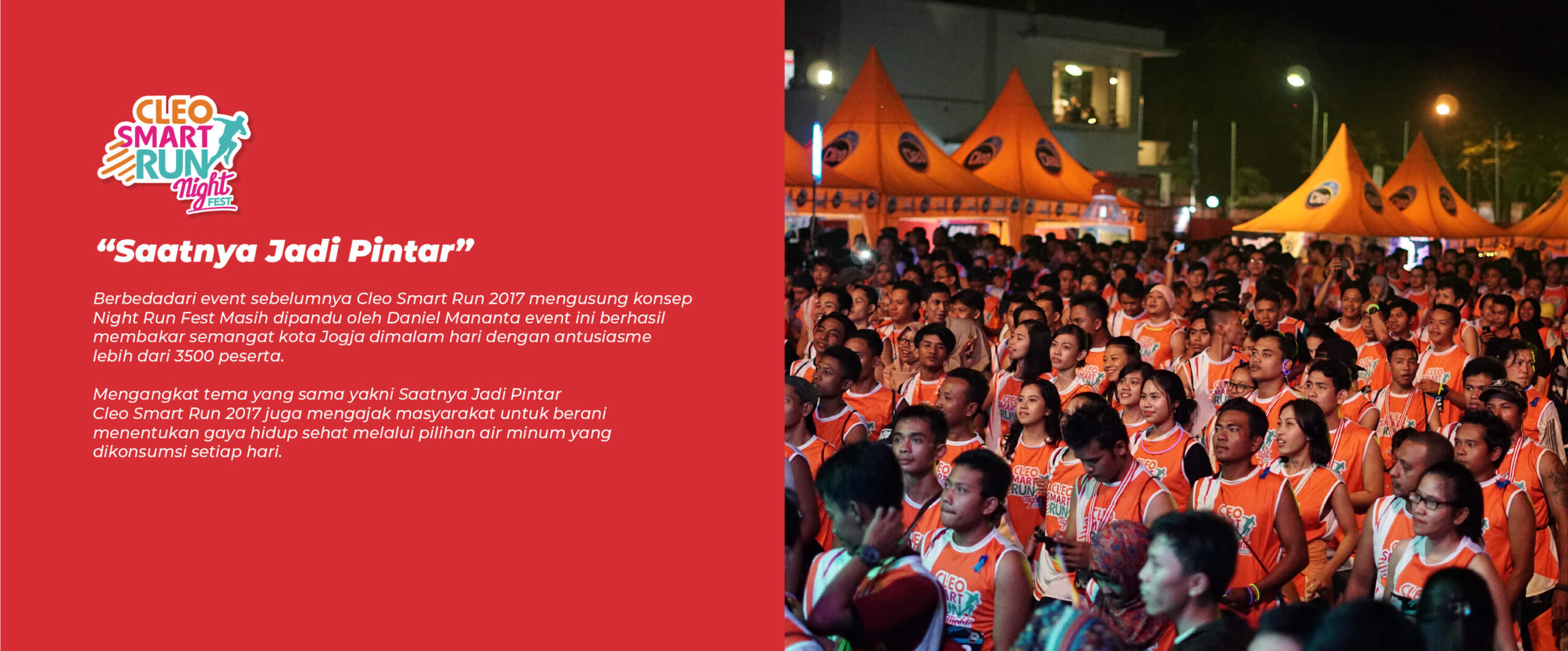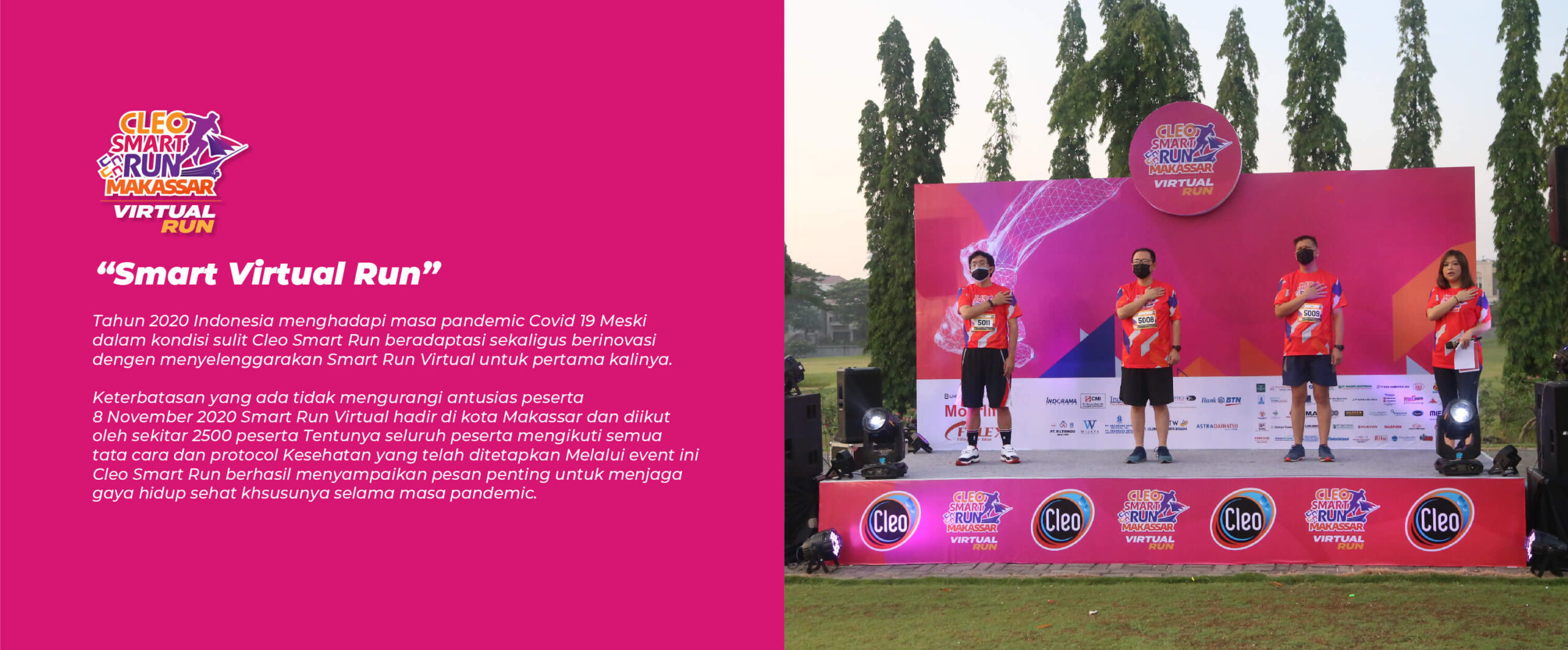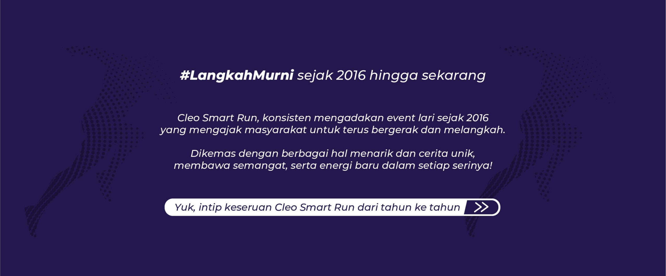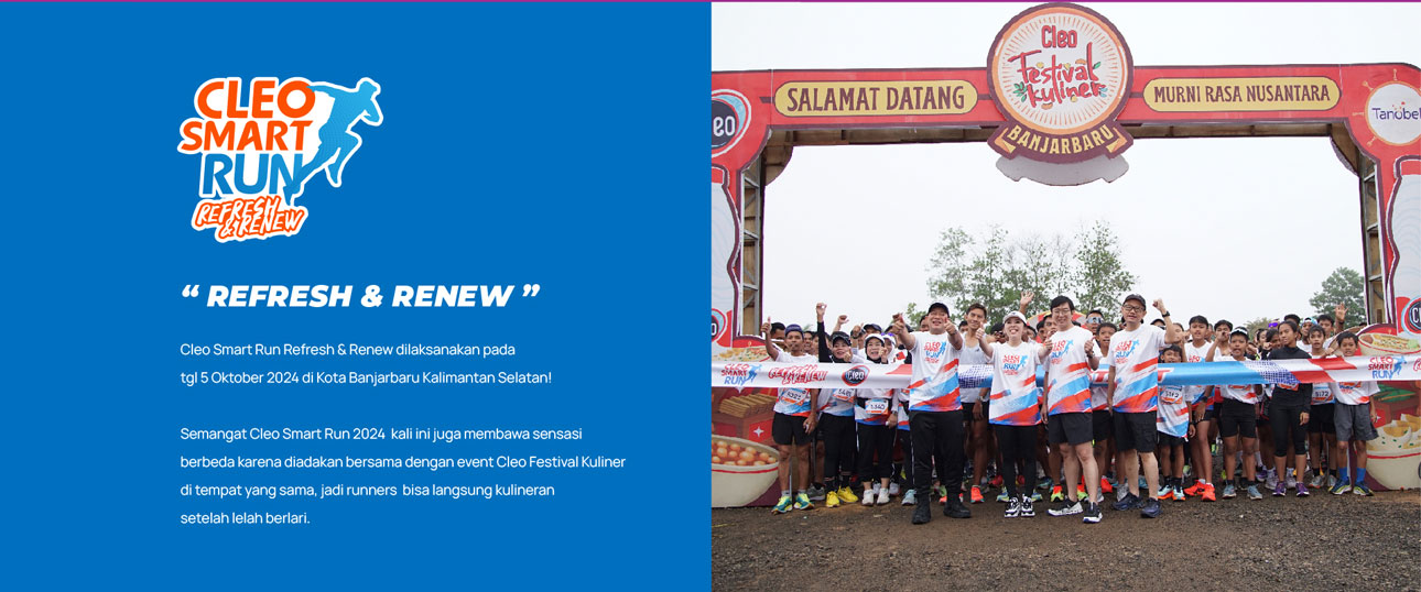 Cleo Smart Run hadir kembali di tahun 2025! Setelah berlangsung di kota Surabaya, Jogja, Bali, Makassar, Malang dan Banjarbaru tahun ini Cleo Smart Run kembali hadir dan menyapa Sahabat Sehat di pulau Sumatera! Raih kemenanganmu dengan medali yang melengkapi seri-seri sebelumnya. Dimulai dari #LangkahMurni, bergerak sekarang, melangkah hari ini.